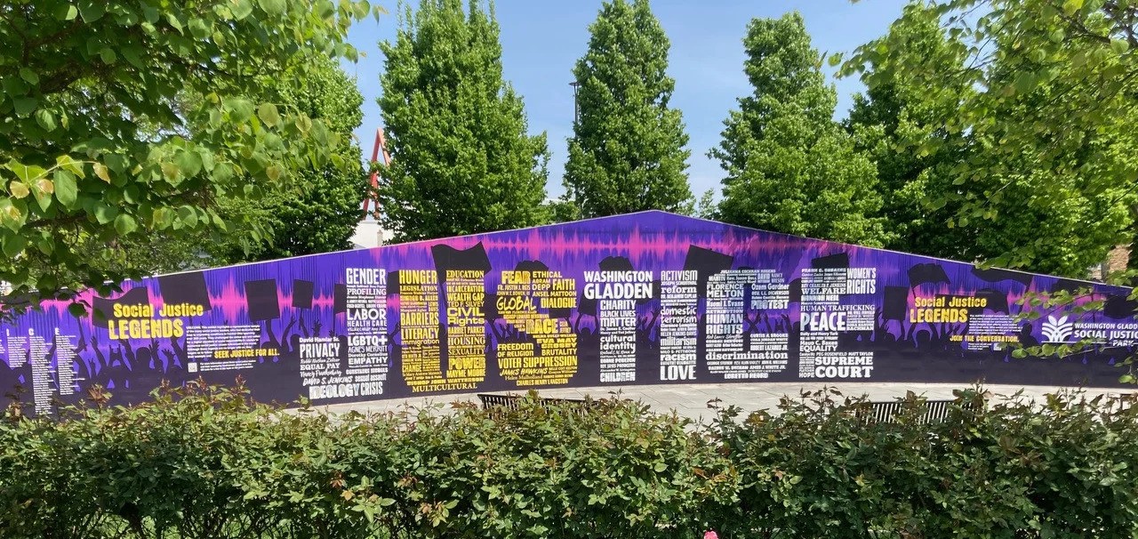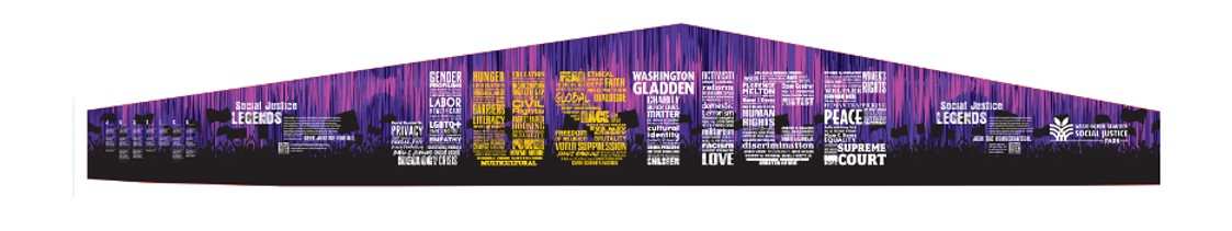 In May 2022, a custom-designed, 100’ mural became the latest artwork to be displayed at Jeffrey Plaza of the Washington Gladden Social Justice Park.  The mural is composed of over 160 names of past social justice leaders and includes more than 50 terms or slogans identifying various social justice issues or causes.  Formation Studio of Columbus created the unique design that wove designated names and words to form the letters:  J–U–S–T–I–C–E  that can be seen a block away.  Park volunteers with initial support of the staff of the Columbus Metropolitan Library conducted the research to identify a representative sample of social justice trailblazers from Central Ohio whose notable community service spans over 200 years.  The mural is on display for 2022 into 2025.